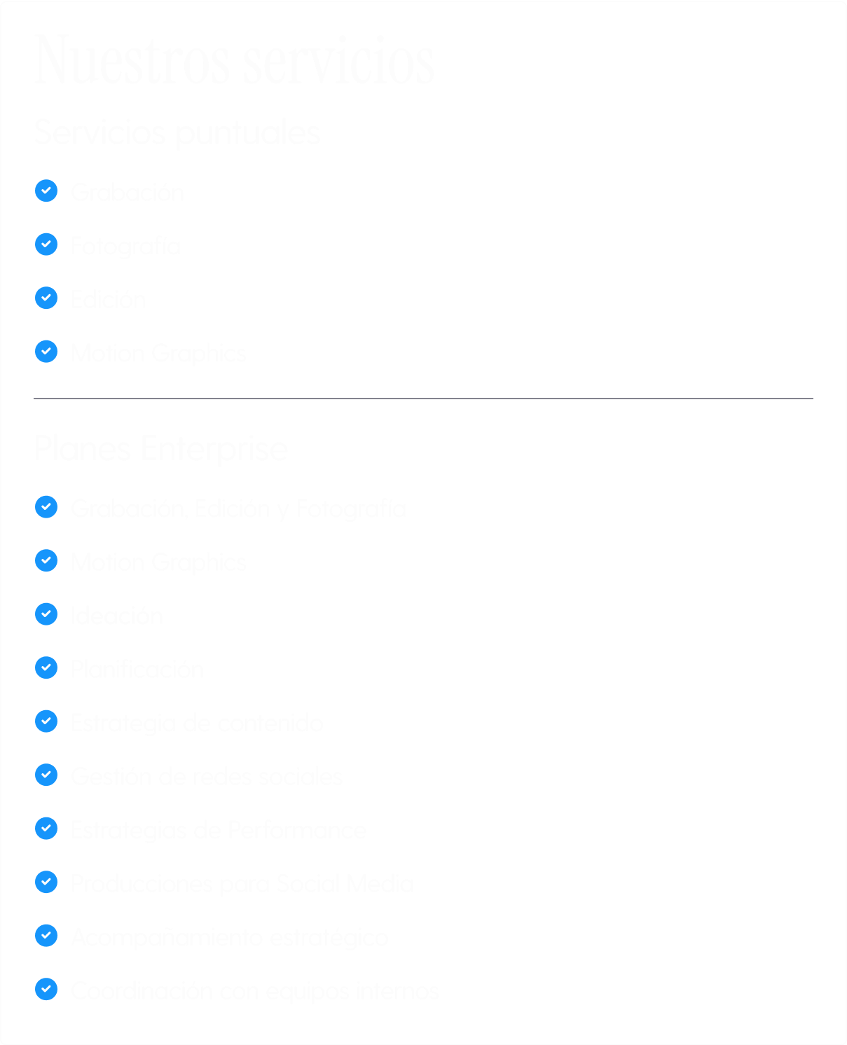 Enterprise Plans: designed for teams that produce content on a recurring basis. They include strategy, planning, ideation, production, and follow-up, with monthly support tailored to your goals. Prices range from €1,500 to €3,000/month, depending on each company’s volume and needs.