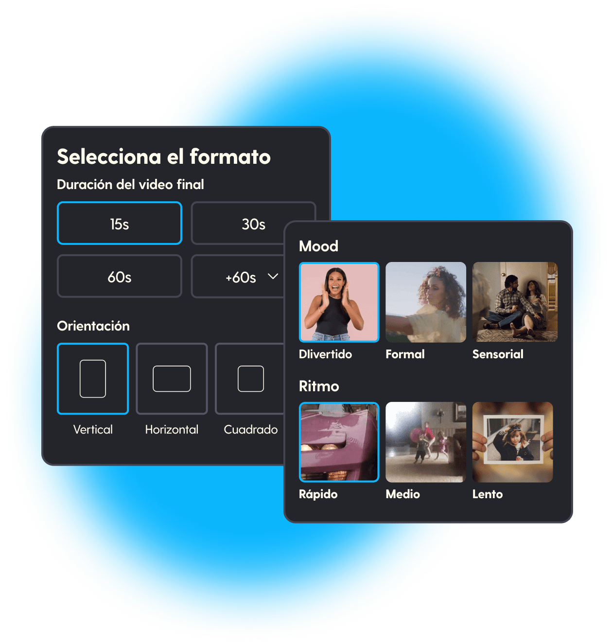 Personaliza la duración, orientación, mood y ritmo de tu proyecto. Adapta cada video a su uso previsto y dale tu toque distintivo.